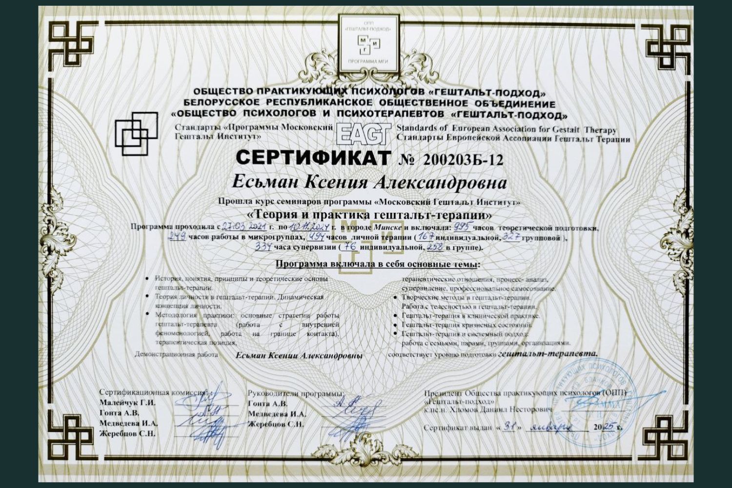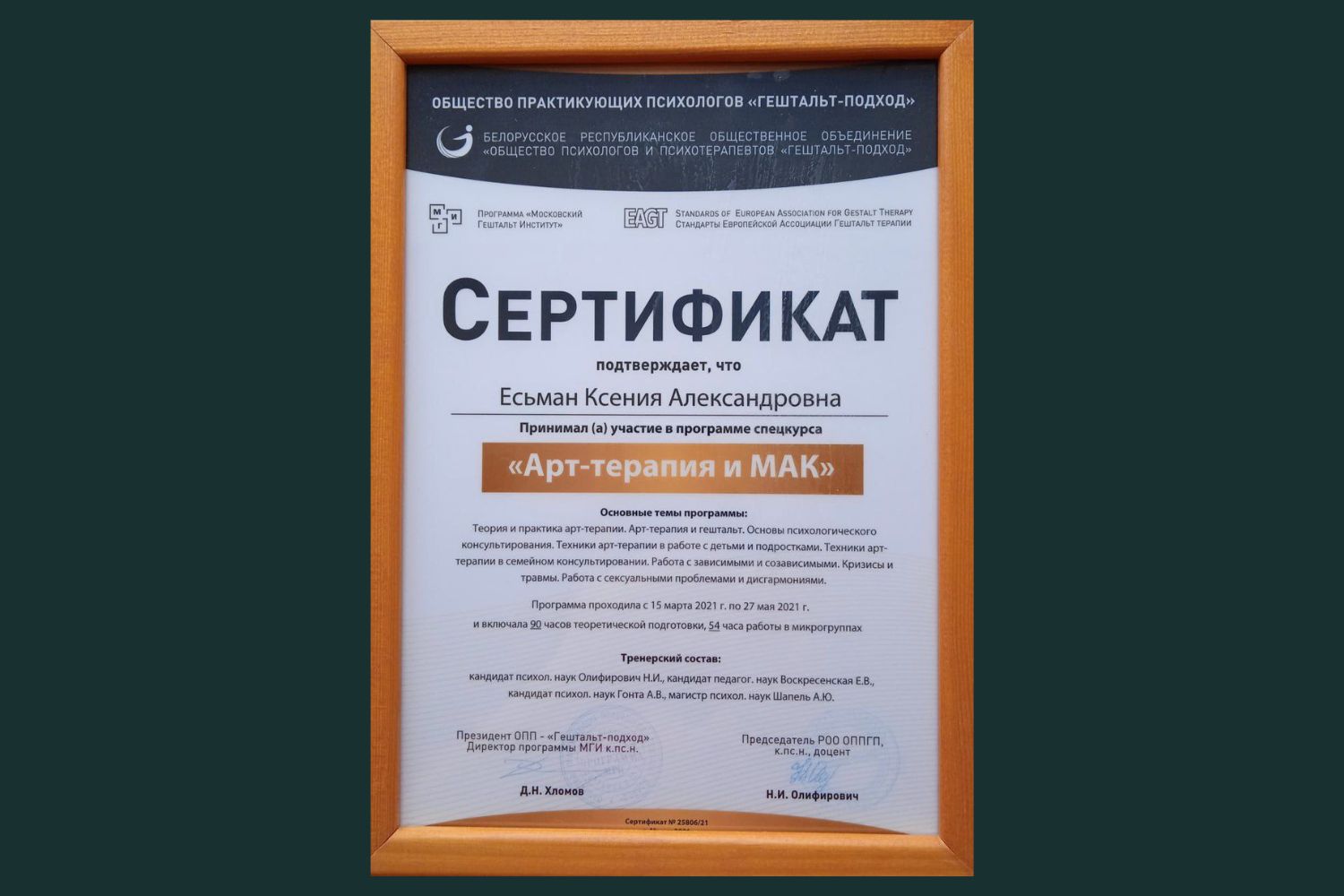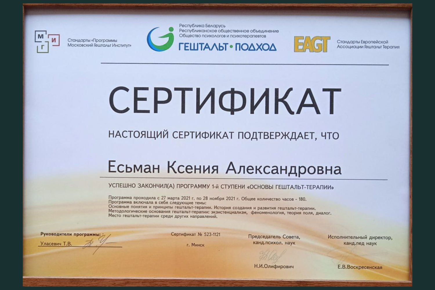 Я являюсь аккредитованным психологом Белорусского республиканского общественного объединения «Общество психологов и психотерапевтов «Гештальт-подход».