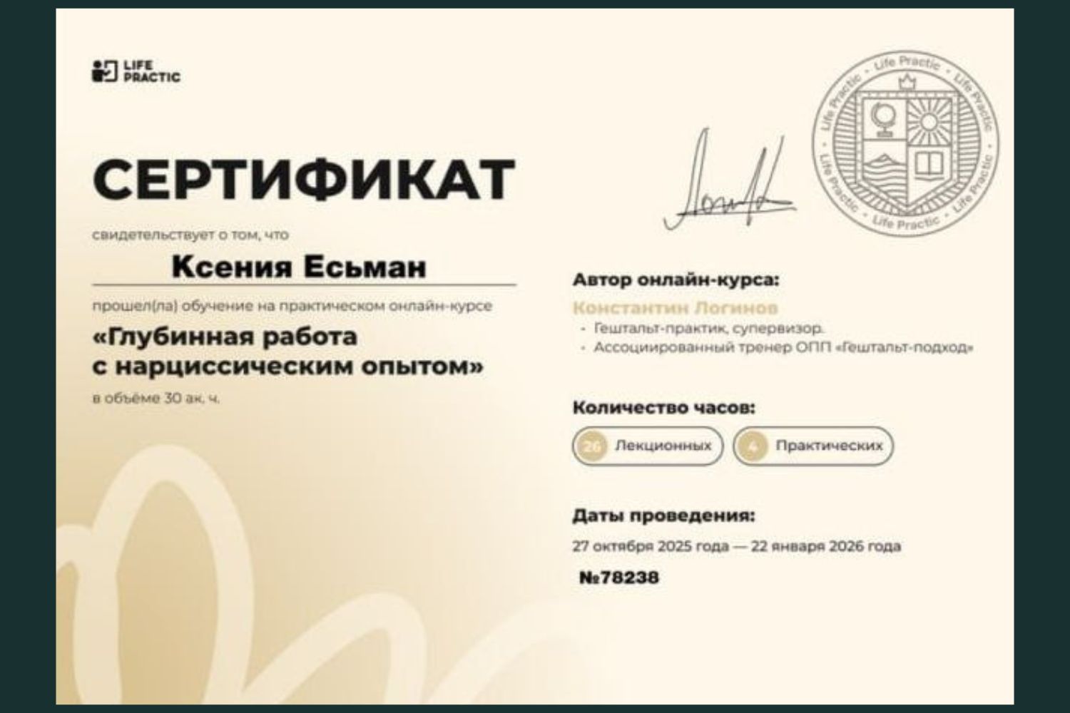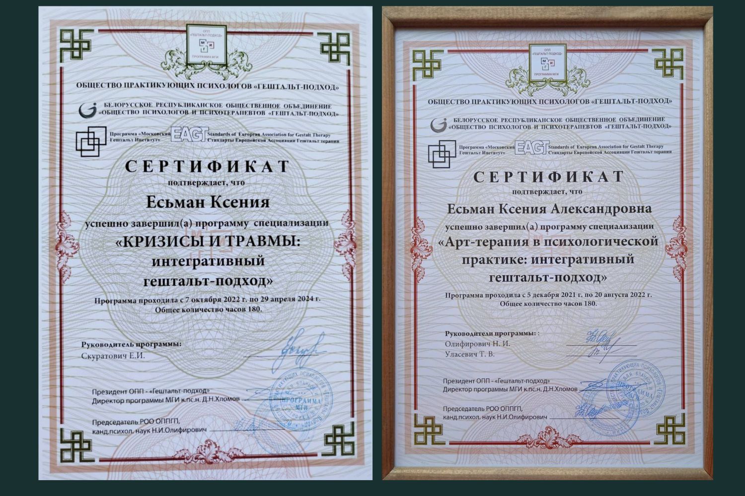 Кроме базового образования я завершила длительное обучение гештальт-терапии и несколько специализаций по различным направлениям: